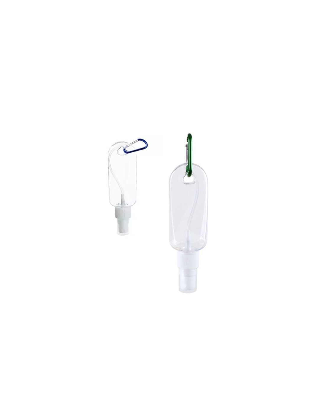Botella spray atomizador con colgador de plastico pet traslúcido con tapa blanca y carabiner. Capacidad: 50ml. Colores carabiner: plateado, azul, rojo y negroBotella spray Antibacterial