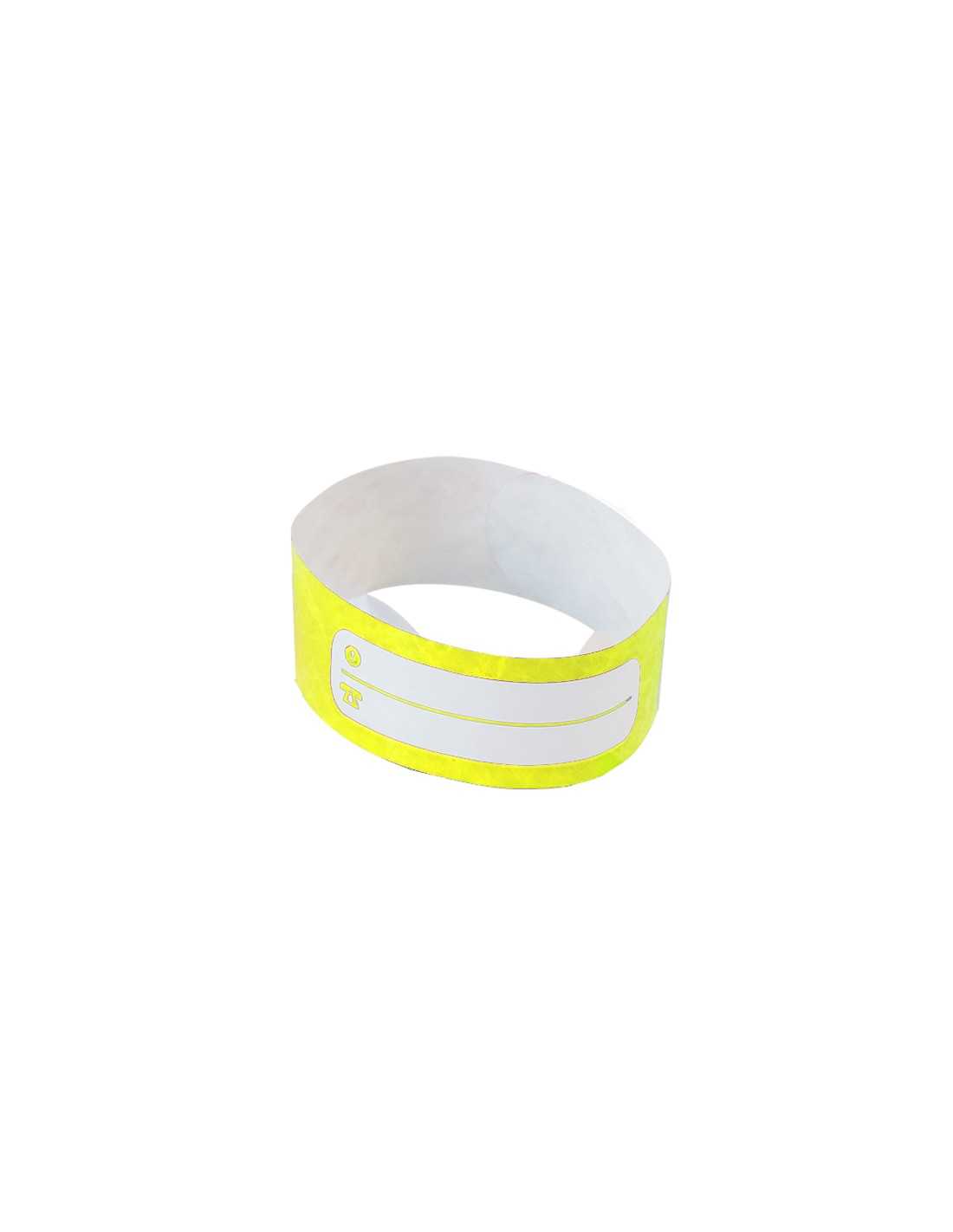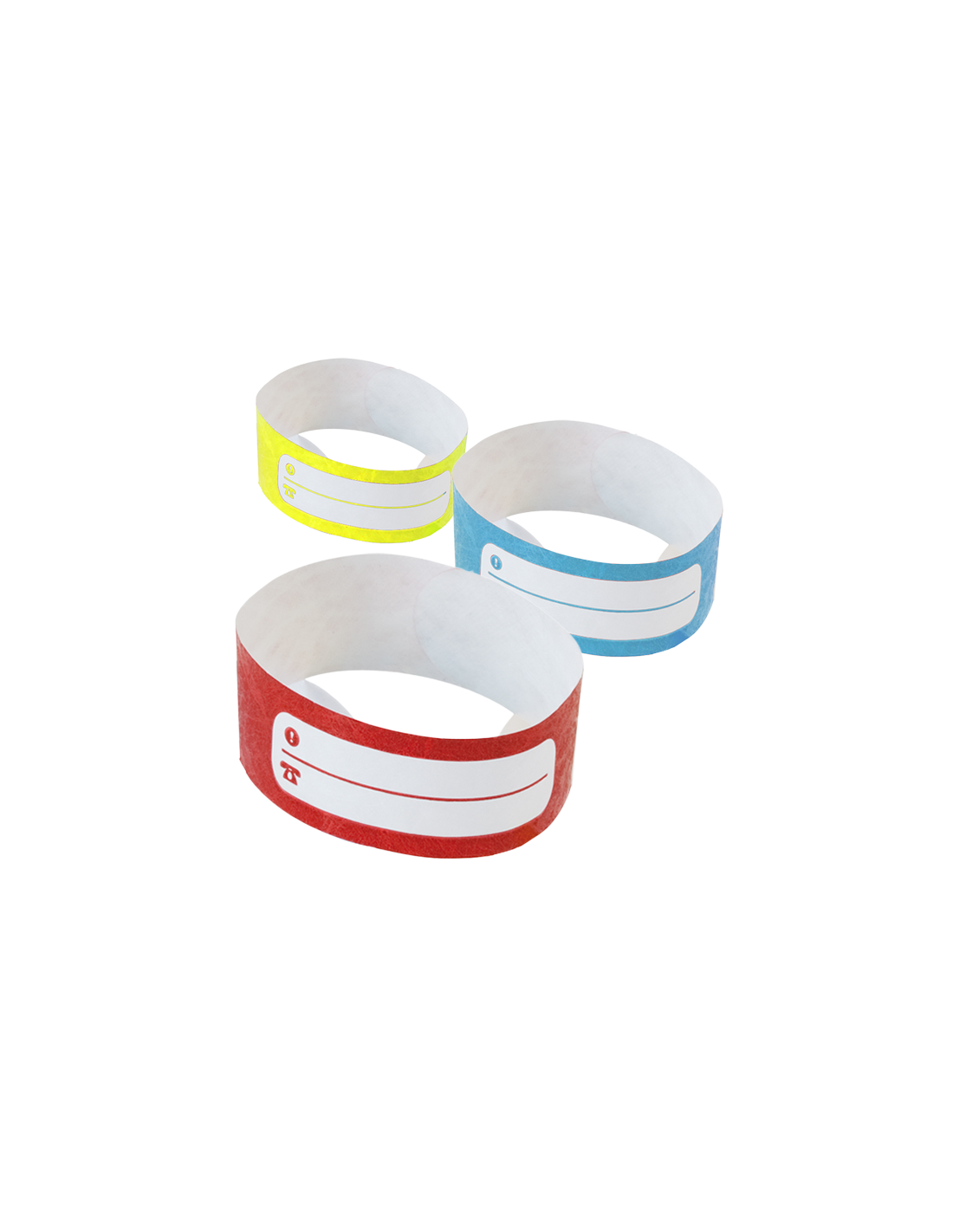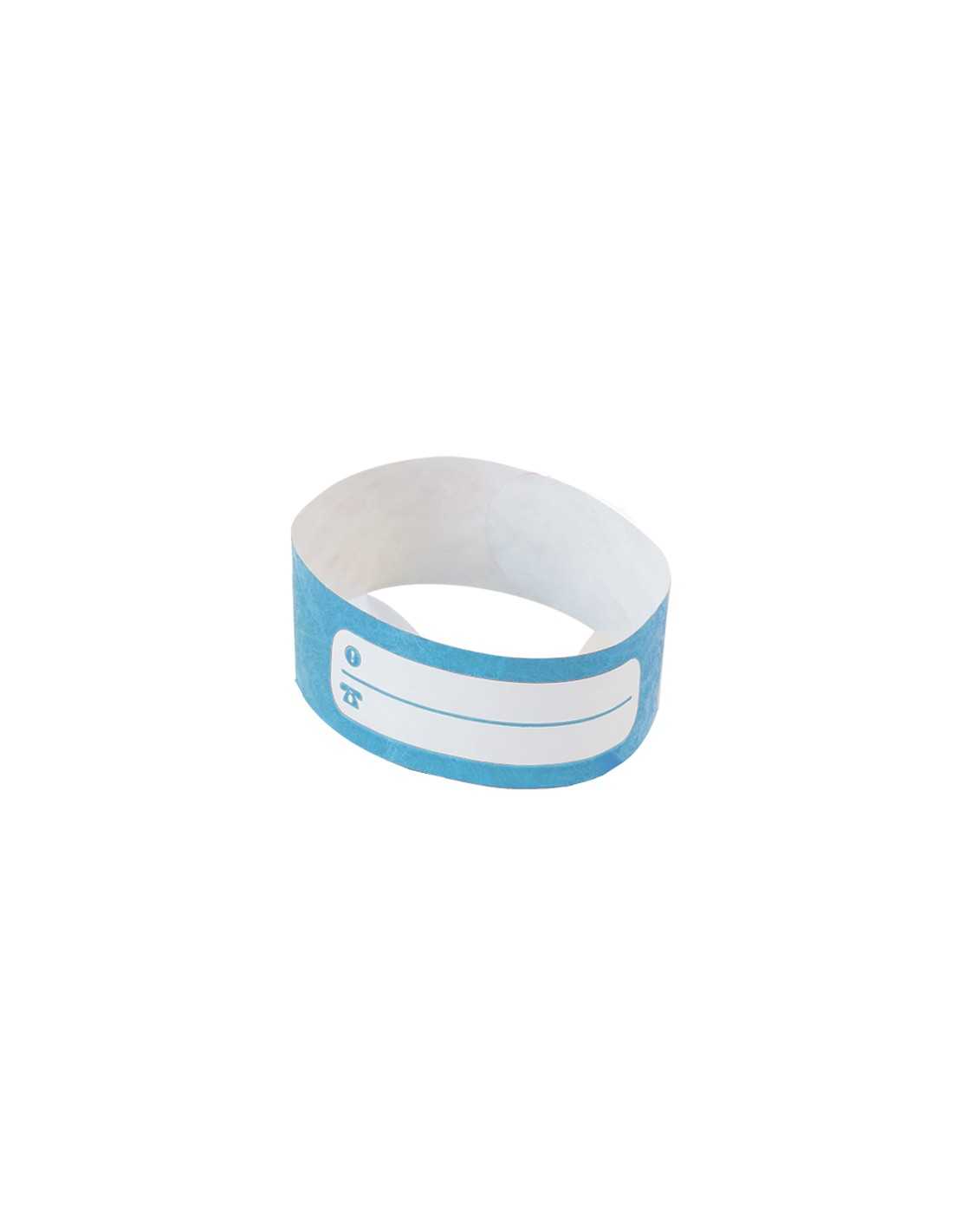 Pulsera en fibra sintética para niño en variada gama de vivos colores. Con campos de identificación, de cierre adhesivo, resistente al agua y presentada en plancha troquelada de 10 piezas.