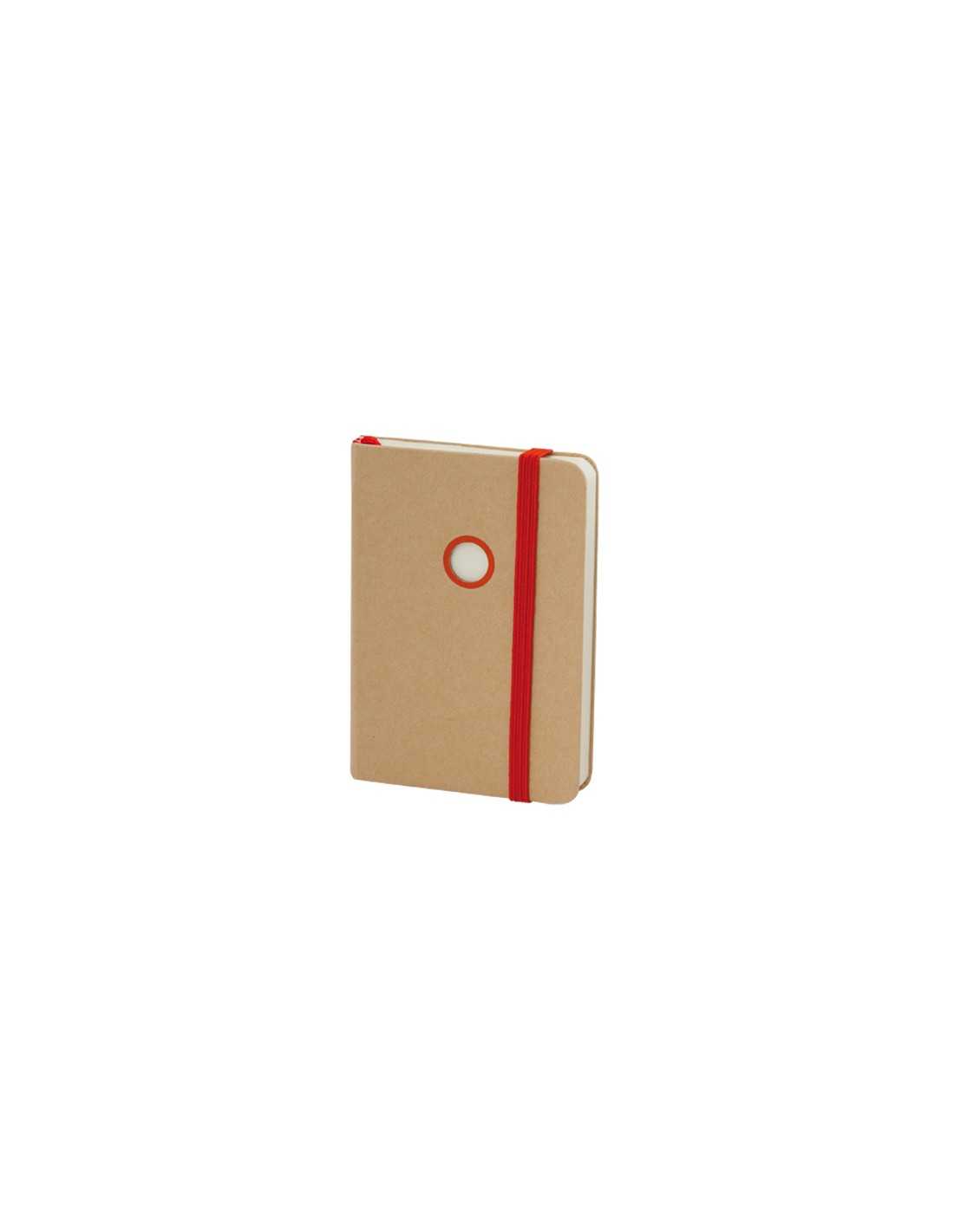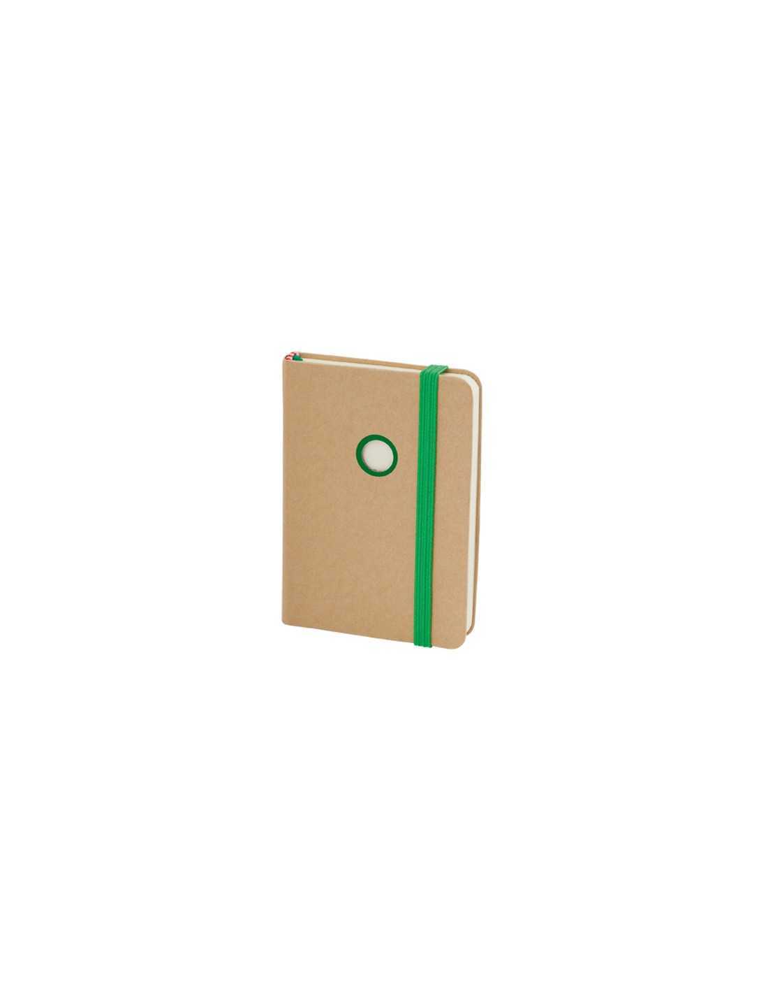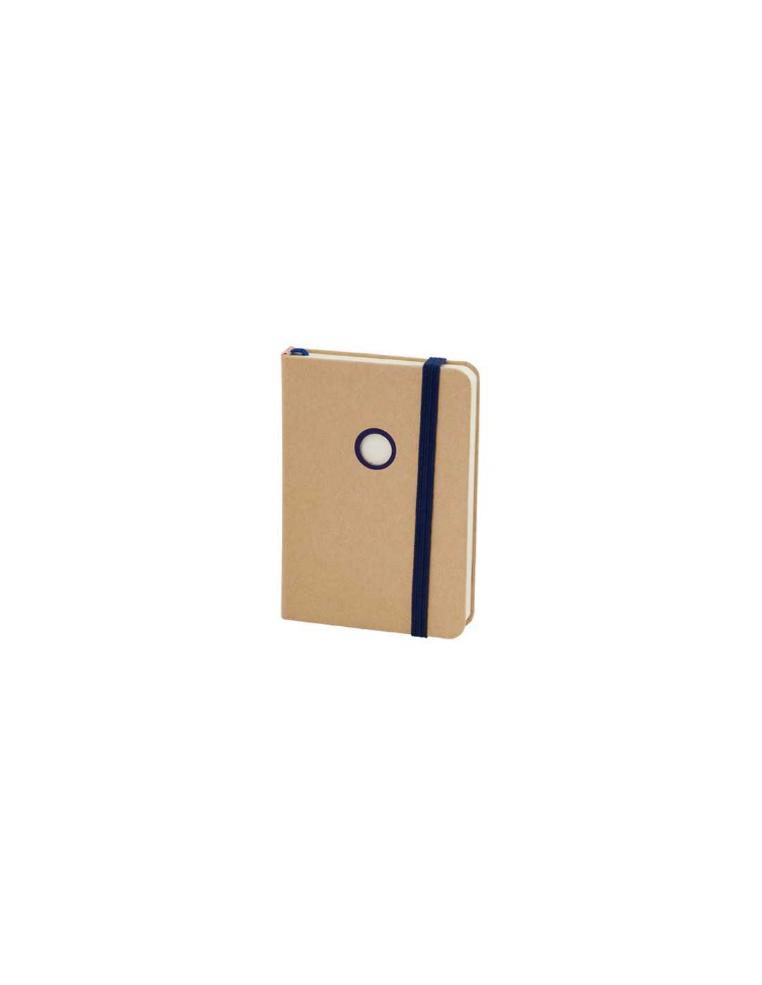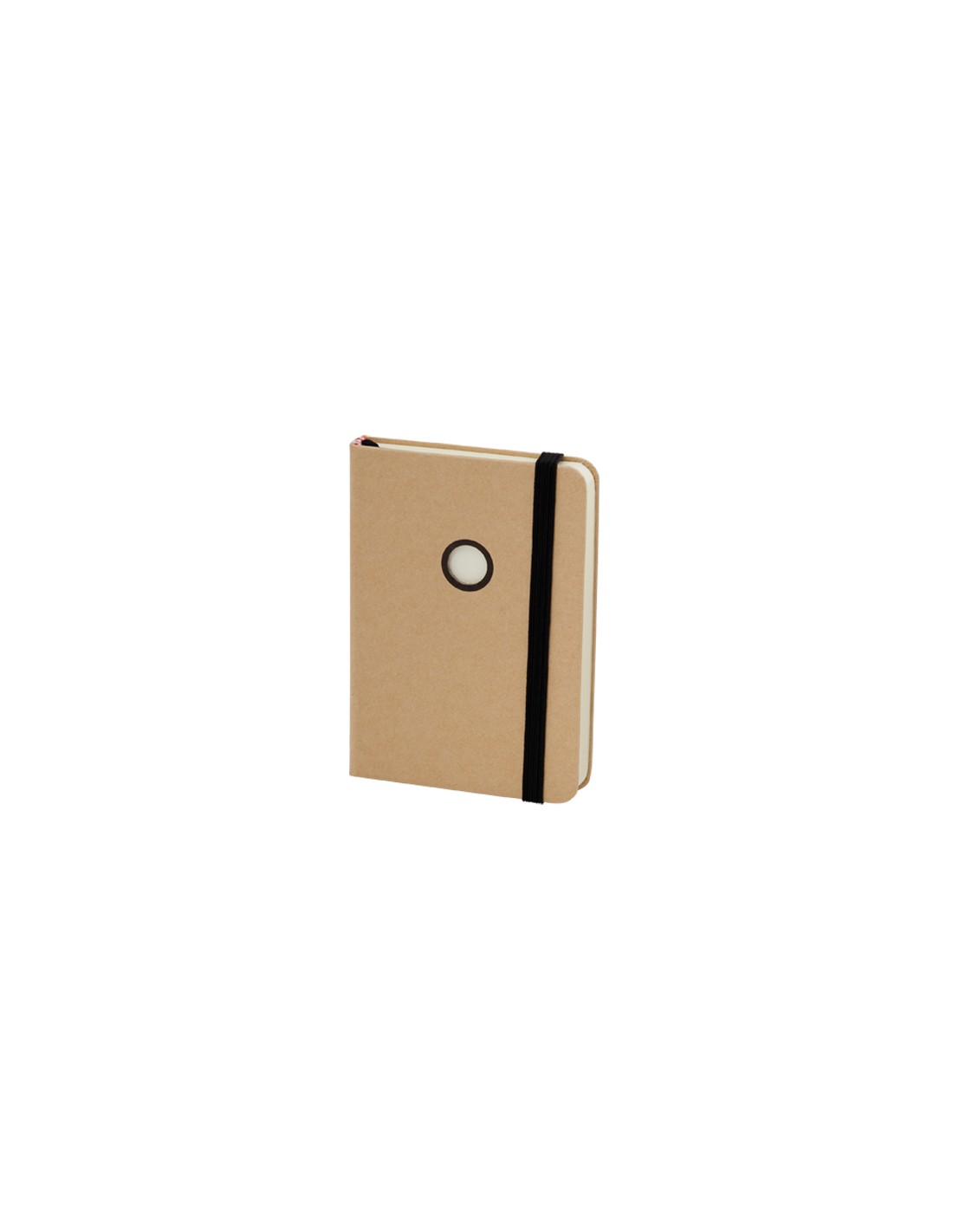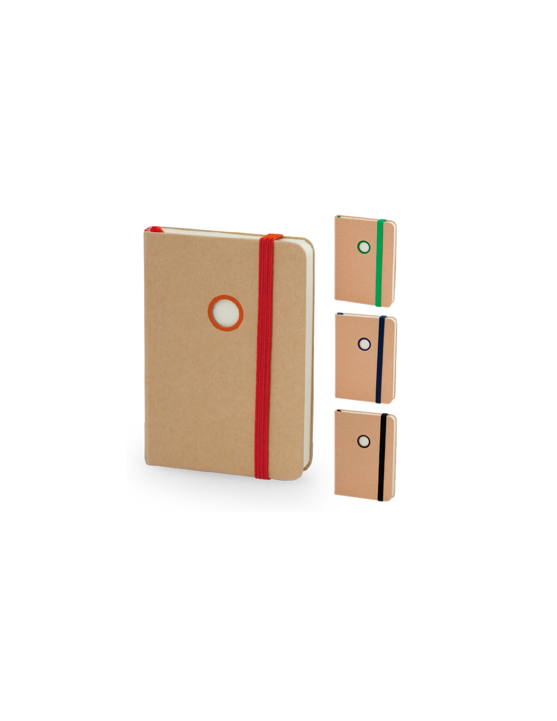 Bloc de notas con tapas de suave tacto acabadas en resistente cartón reciclado y troquelado en portada. De 100 hojas lisas, con elástico de sujeción y marcapáginas de tela a juego.