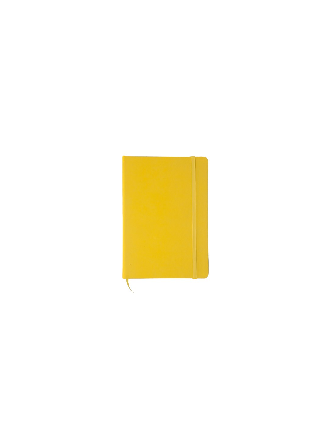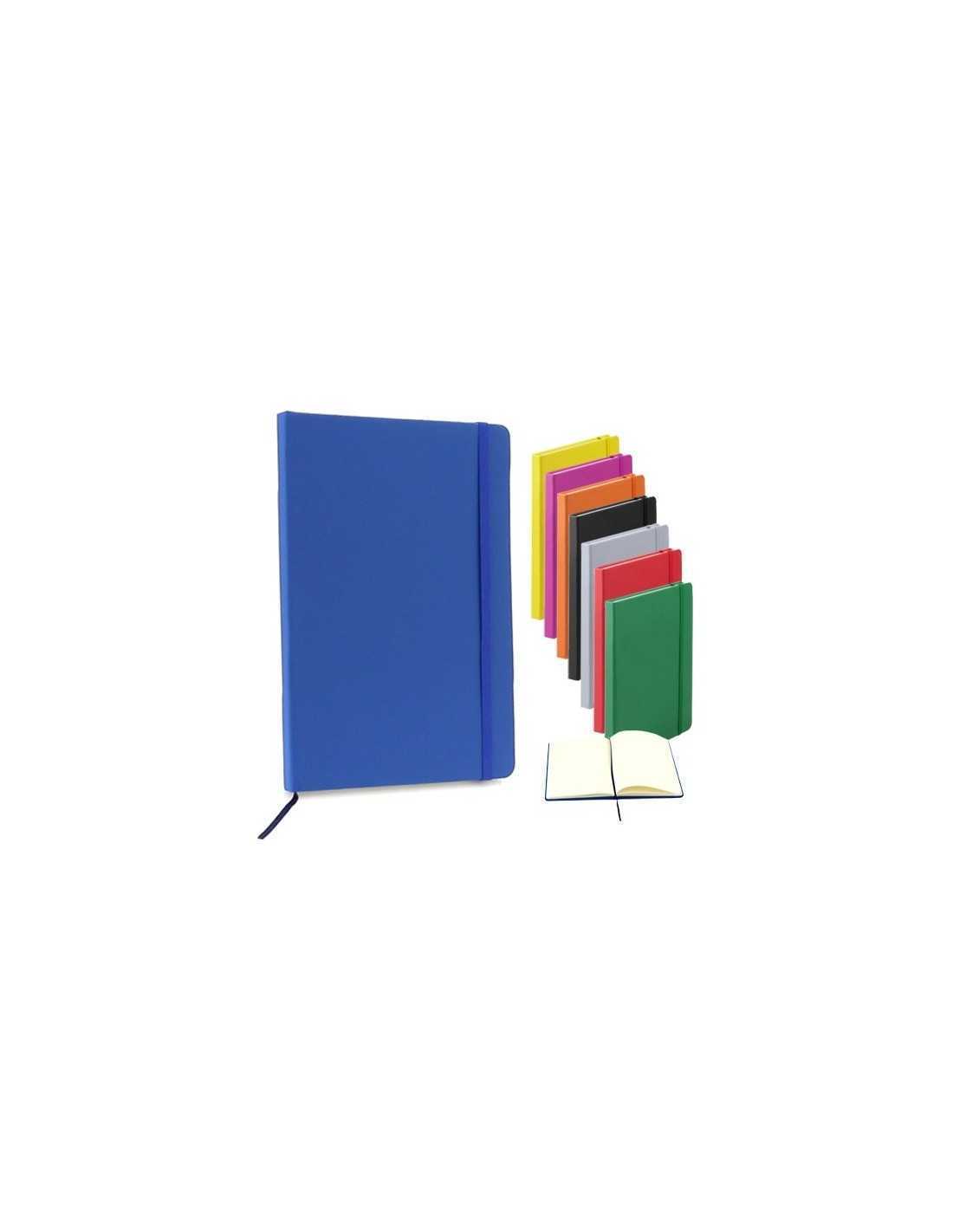 Bloc de notas con tapas de suave tacto, acabado en polipiel y en desenfadados colores. De 100 hojas lisas, con elástico de sujeción y marcapáginas de tela a juego.