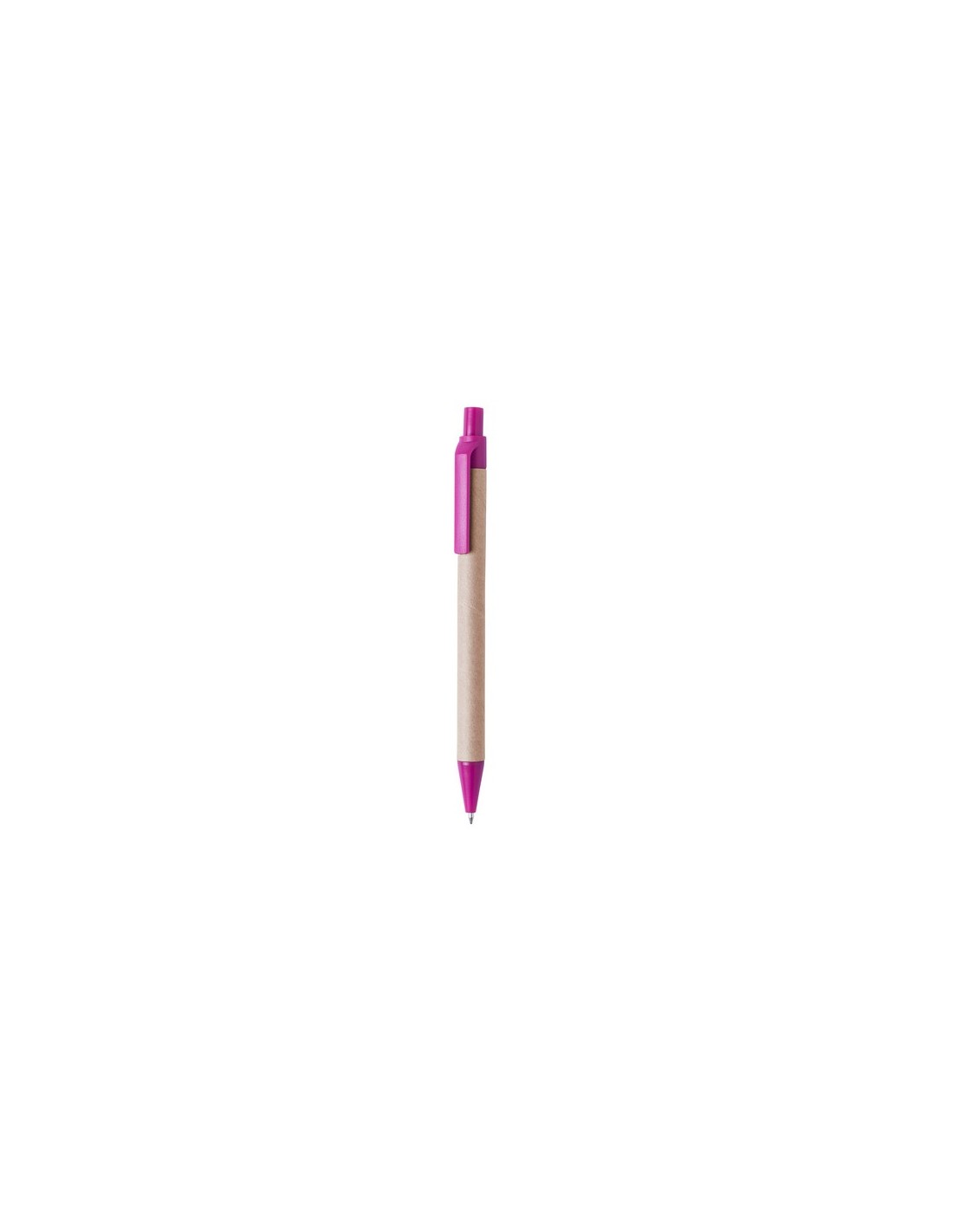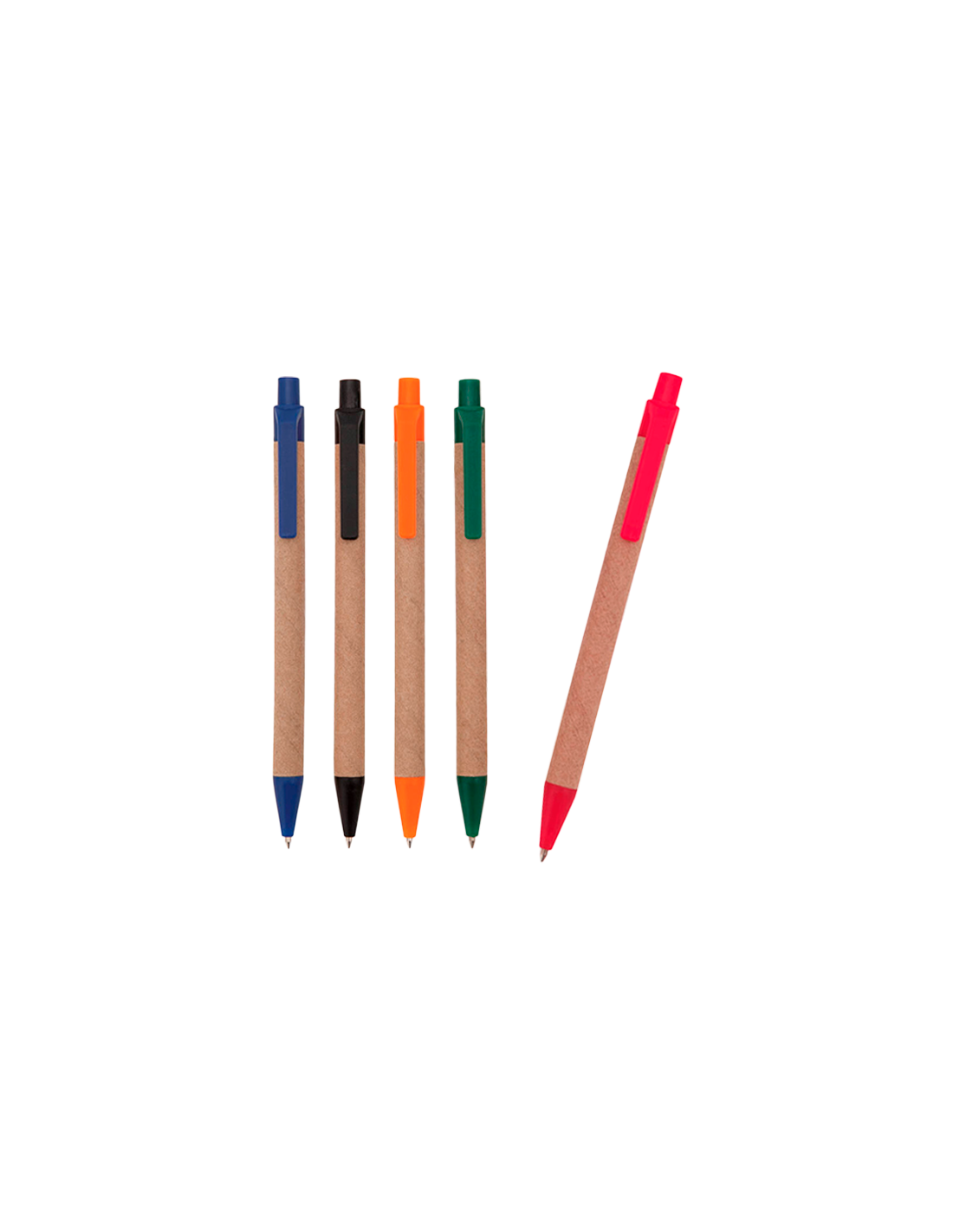 Lapiceros de mecanismo pulsador en original combinación de cuerpo en cartón reciclado de color natural y accesorios en vivos colores. Tinta azul.