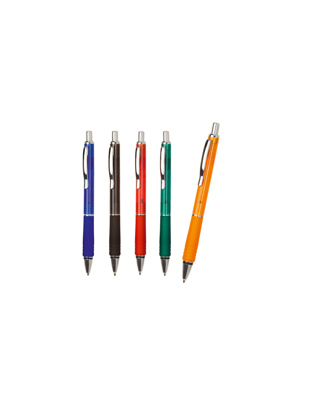 Lapiceros de mecanismo pulsador de elegante diseño bicolor con accesorios en color plateado brillante y cuerpo de suave acabado en llamativos colores translúcidos. Con cómoda empuñadura a juego, clip metálico curvado y anilla a juego. Tinta azul.