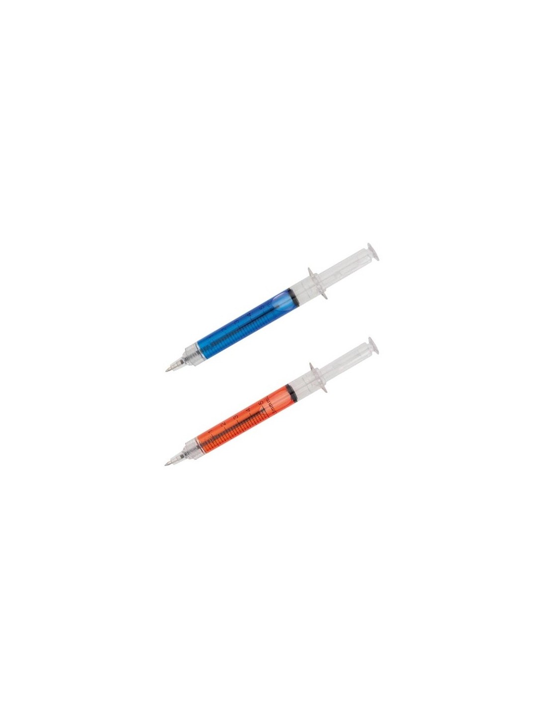 Original Lapiceros con diseño de jeringuilla y cuerpo transparente. Con líquido interior en vivos colores y de tinta azul.