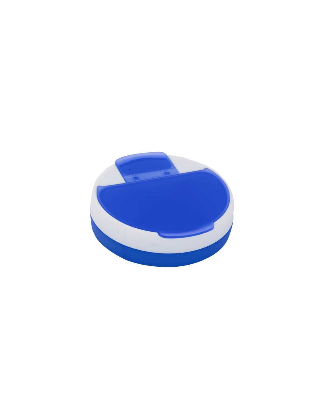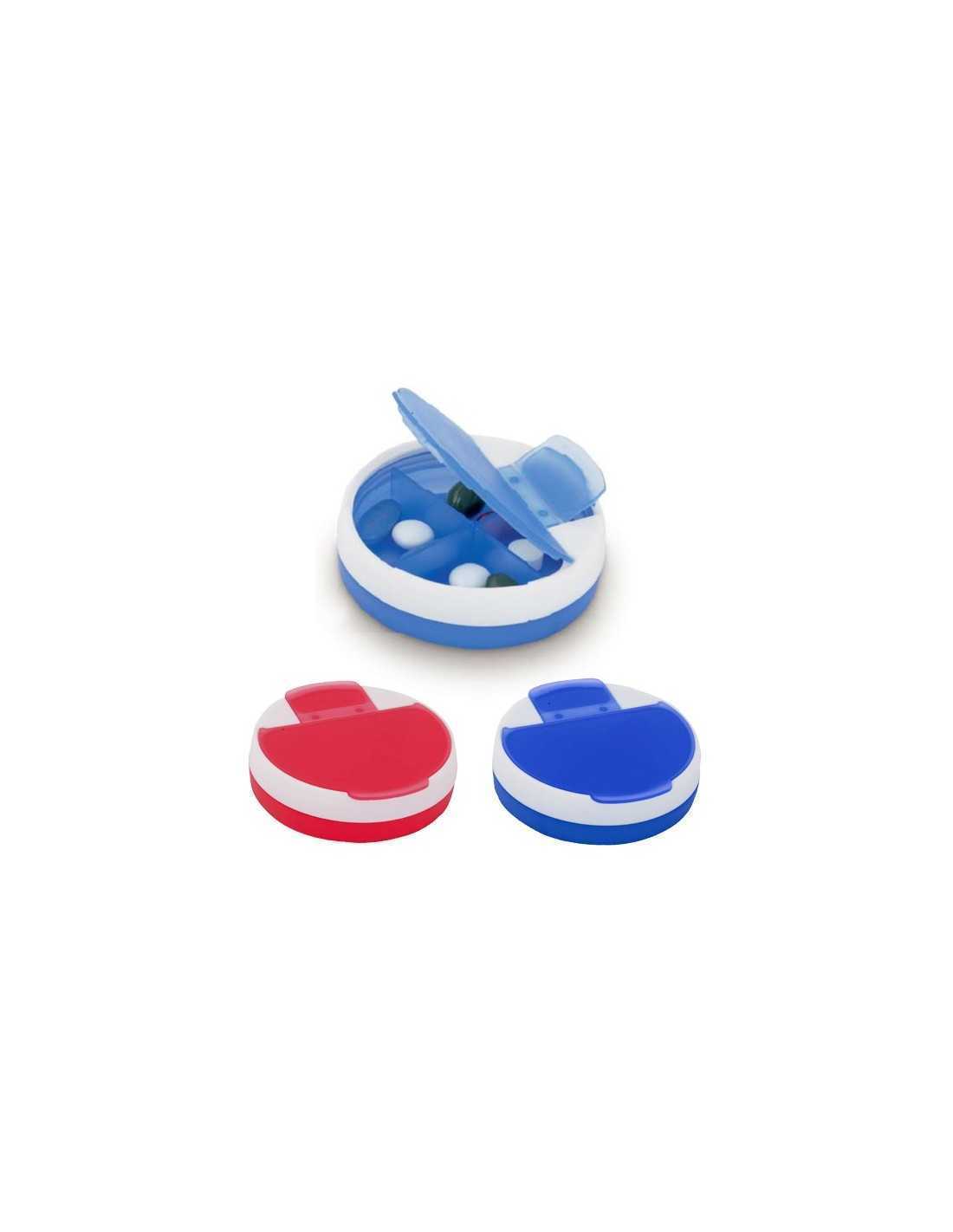 Original pastillero en diseño bicolor con tapa dispensadora de pastillas y 4 compartimentos interiores.