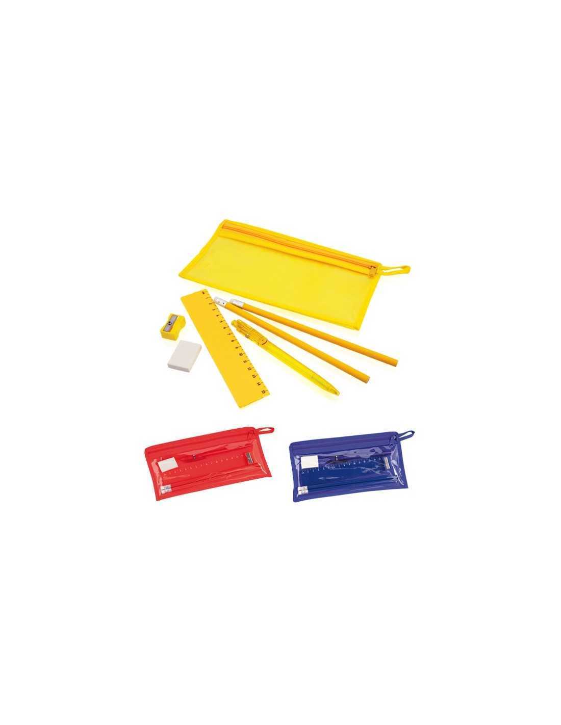 Set de 7 piezas en estuche con cuerpo en non-woven de vivos colores y ventana transparente frontal de PVC. Incluye 2 lápices de madera con cuerpo cilíndrico y goma, Lapiceros, goma, sacapuntas y regla de 15cm. Con cómoda asa de transporte a juego.