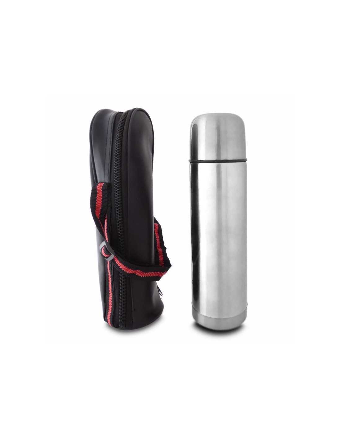Termo metalico Plateado de 1/2 litro de capacidad, con funda negra para llevar. Termo Plateado Personalizado Colores: Plateado.