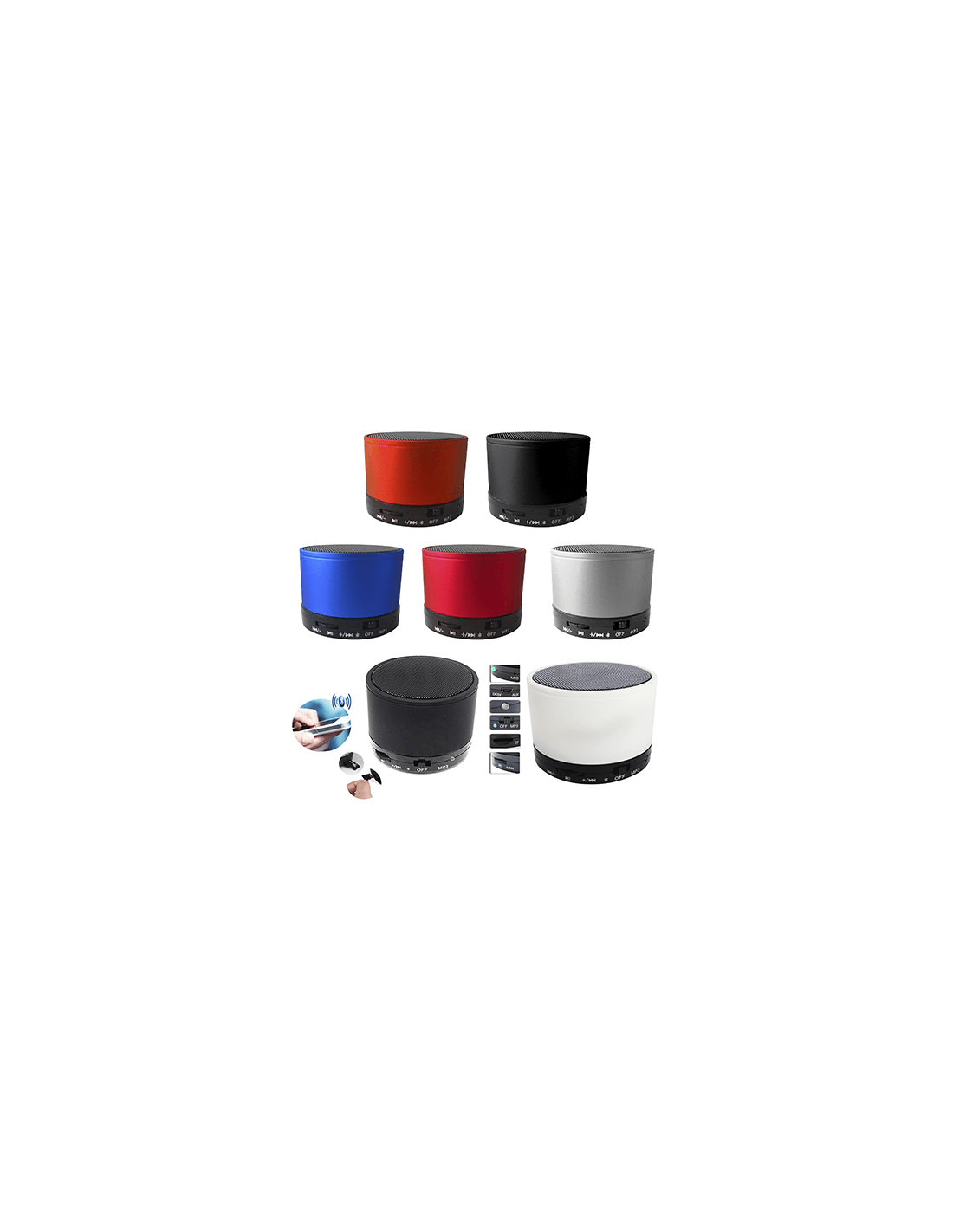 Mini parlante Bluetooth Fabricado con metal.Altavoz bluetooth estéreo. · Manos libres / Salida mini USB a Mini Plug y Micro SD · Incluye cable micro USB para cargar.Tiempo de carga: 1-2 hs Base de goma anti resbalante Colores: Blanco,Negro,Rojo y azul. Mini parlante Bluetooth Merchandising Medidas: 5,7 cm de diametro x 5,2 cm de al