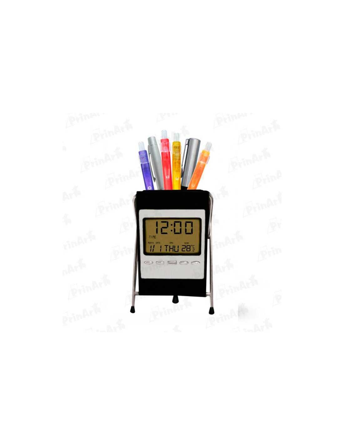 Portalapicero Cuerina Portalapicero con cuerina y soporte de metal, con reloj en la parte frontal. Colores: Negro con plateado. Portalapicero Cuerina Merchandising Medidas: 10 x 14 x 9 cm.