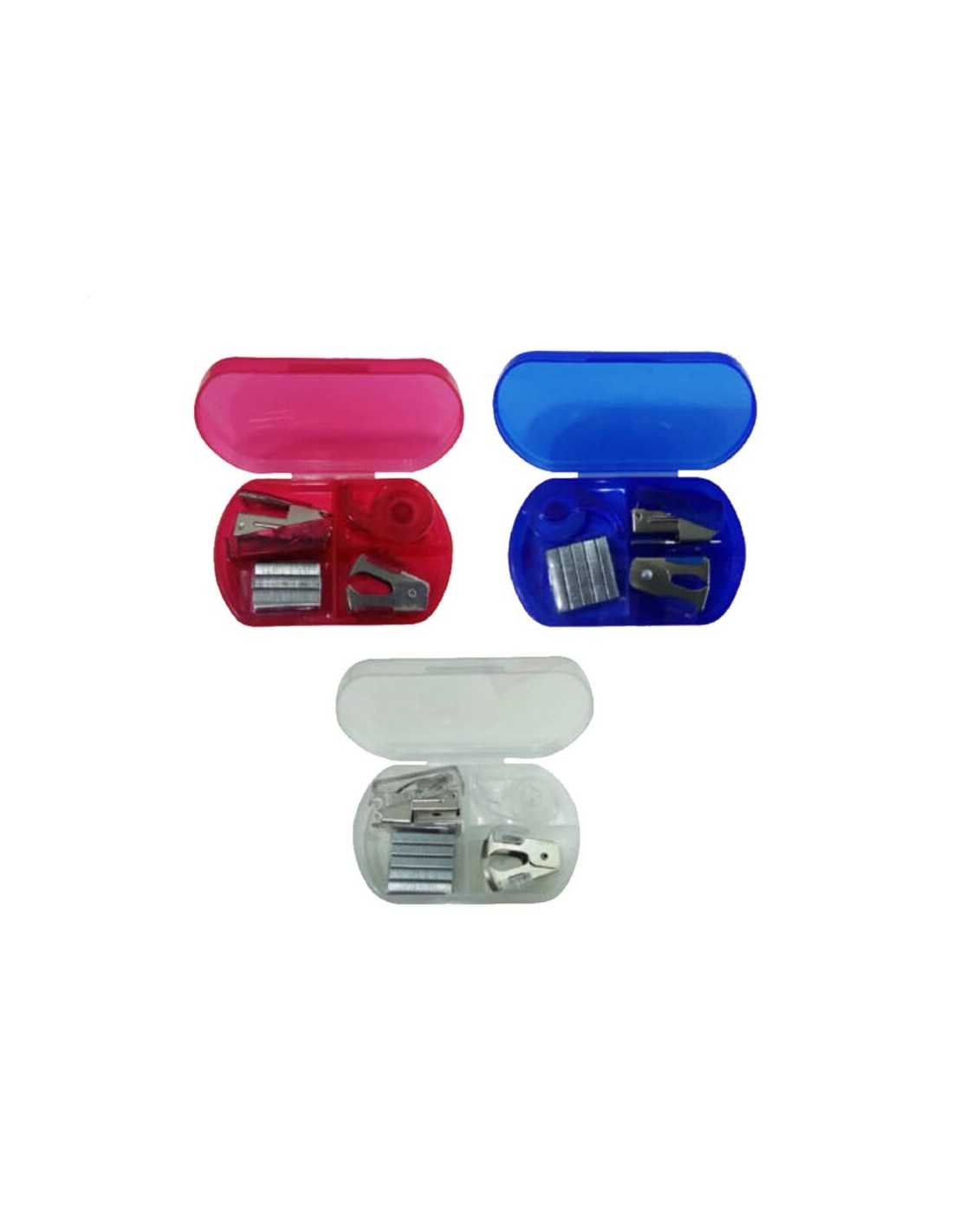 Set de Escritorio Plastico Estuche de plástico transparente, incluye 1 engrampador, saca grapas y dispensador con cinta adhesiva. Medidas: (Estuche) Ancho: 9 cm. Alto: 2 cm. Colores: Azul, rojo y blanco. Medidas: 9 x 2 x 5.7 cm. Set de Escritorio Plastico Transparent