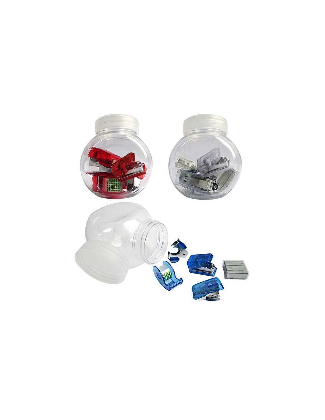 Pote Plastico Estuche de plástico traslucido incluye 1 Saca grapas · 1 Engrapadora + repuestos · 1 Cinta Adhesiva · 1 Perforadora de un hueco Colores: Azul, rojo y blanco. Medidas: : 7,5 x 7 cm Pote PlasticoPersonali