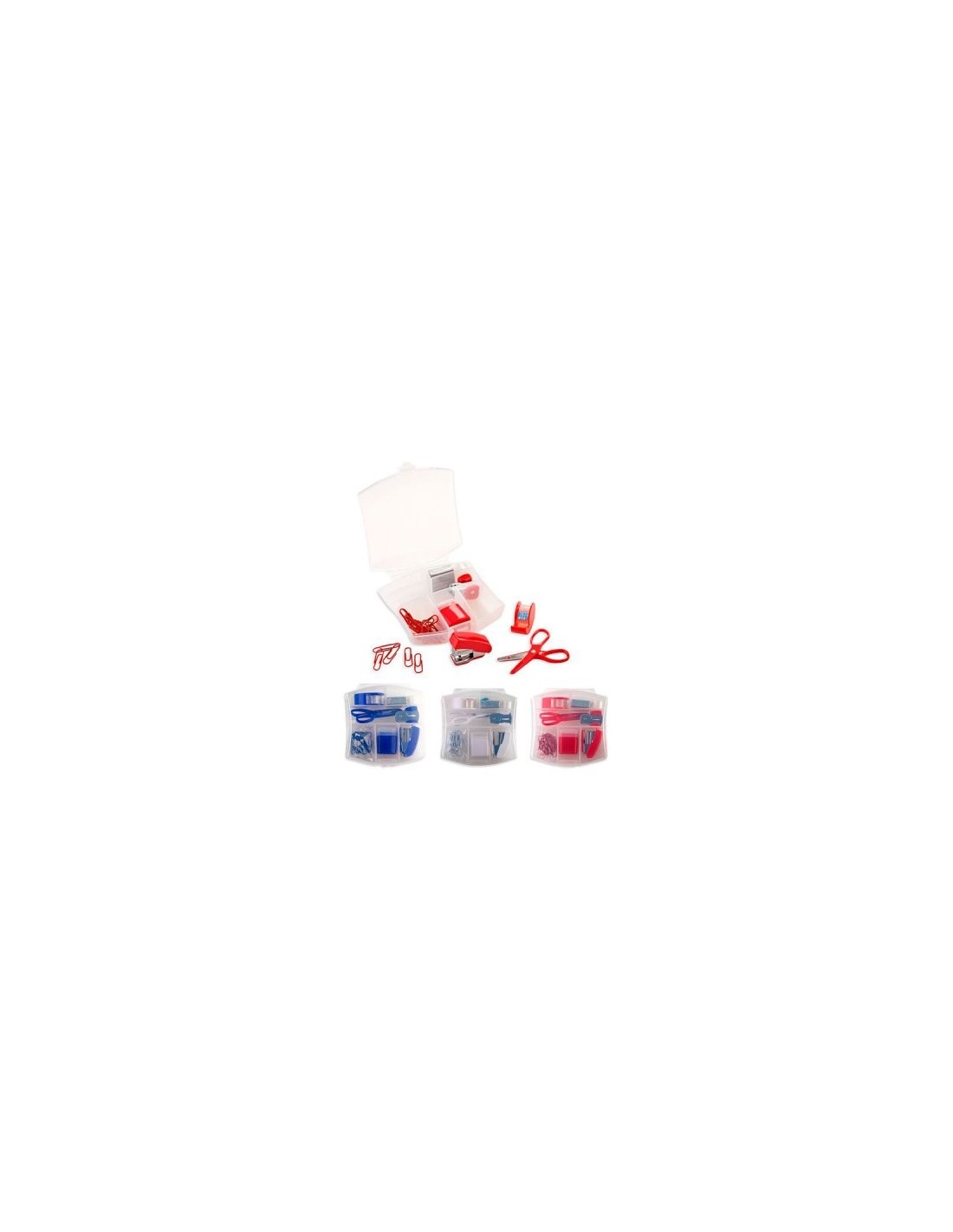 Set de Escritorio Mini Estuche de plástico blanco traslúcido, incluye 1 engrapadora, 1 tajador, 1 perforadora de 1 hueco, 1 sacagrapas, 1 tijera, 1 dispensador con cinta adhesiva, 1 cinta adhesiva de repuesto y grapas.Colores transparente: Rojo, blanco, y azul. Set de Escritorio Mini Publicid