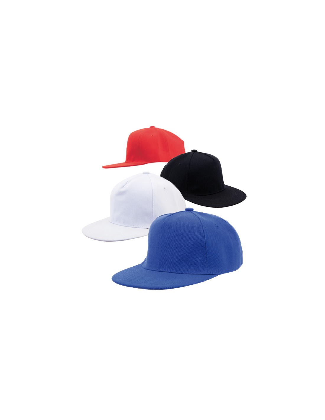Gorra de 5 paneles con visera plana acolchada. En combinación de materiales algodón y poliéster grueso de suave acabado, con cierre ajustable de velcro y en vivos colores.