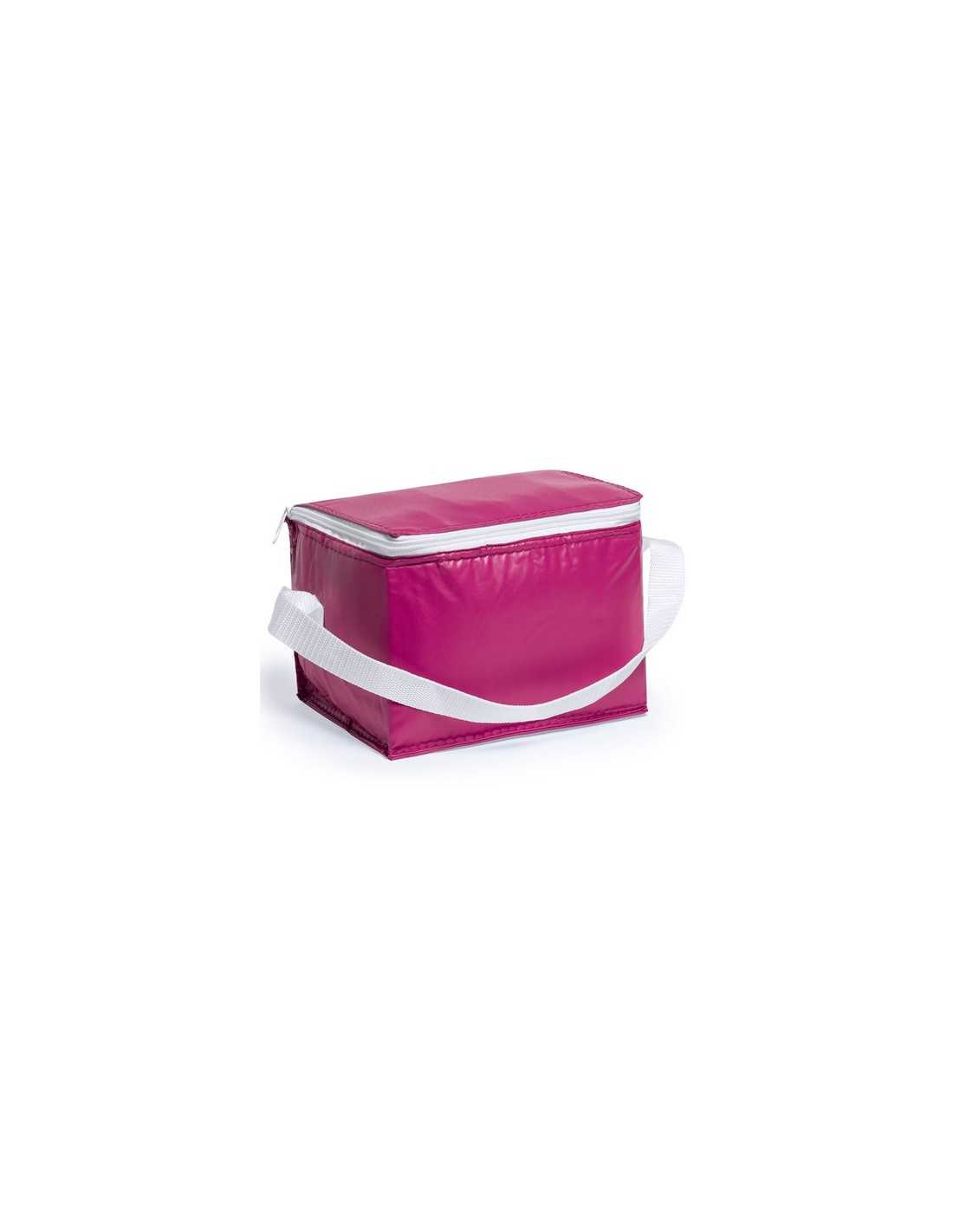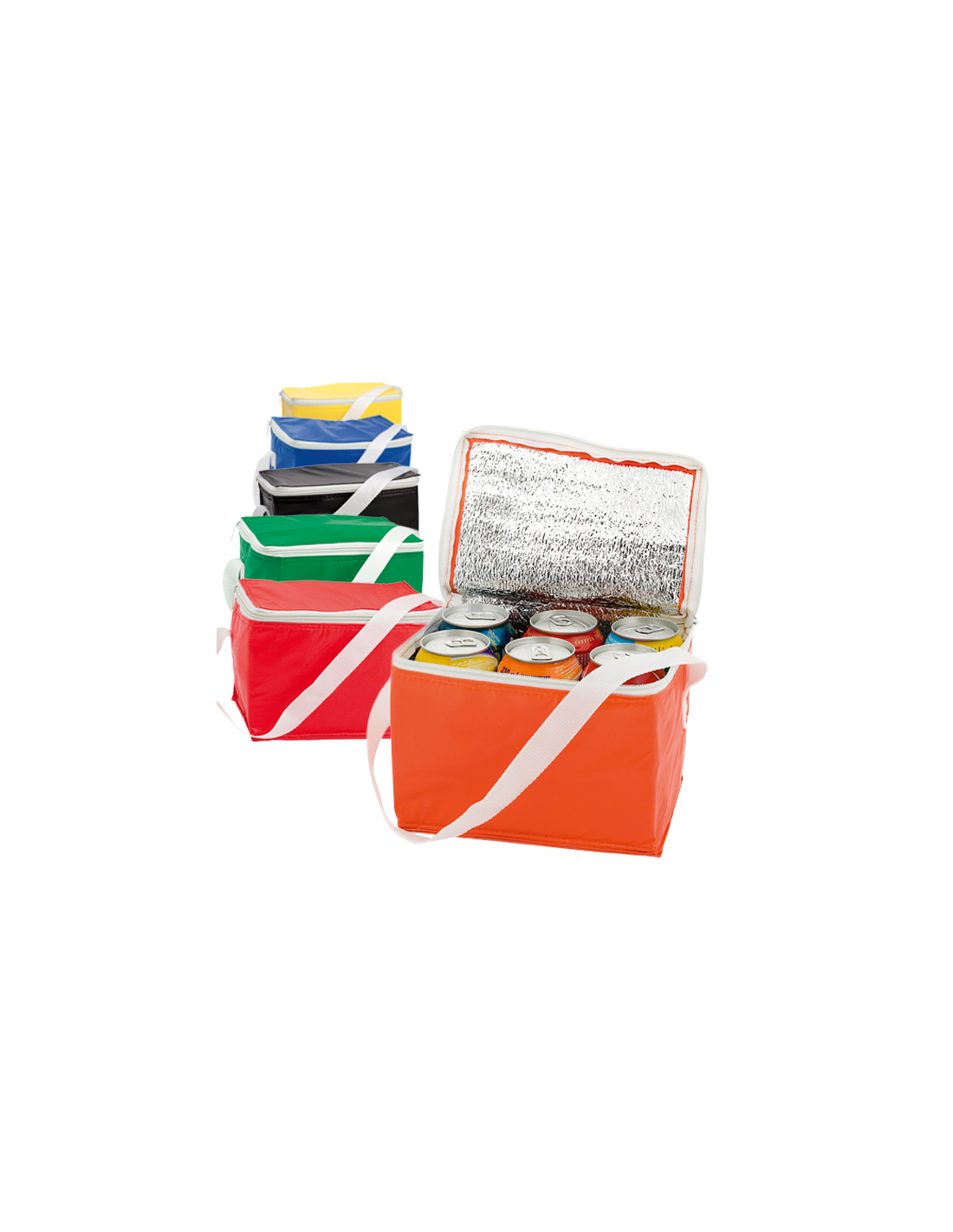 Nevera de 6 latas en resistente PVC de vivos colores. Interior isotermo en acabado de aluminio. Con cremallera y asa de transporte en color blanco a juego.