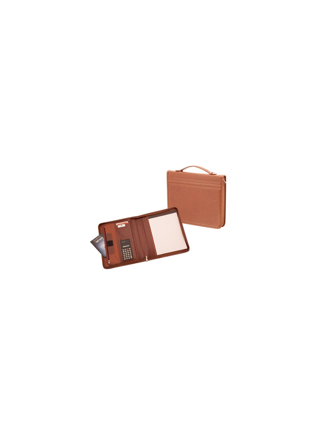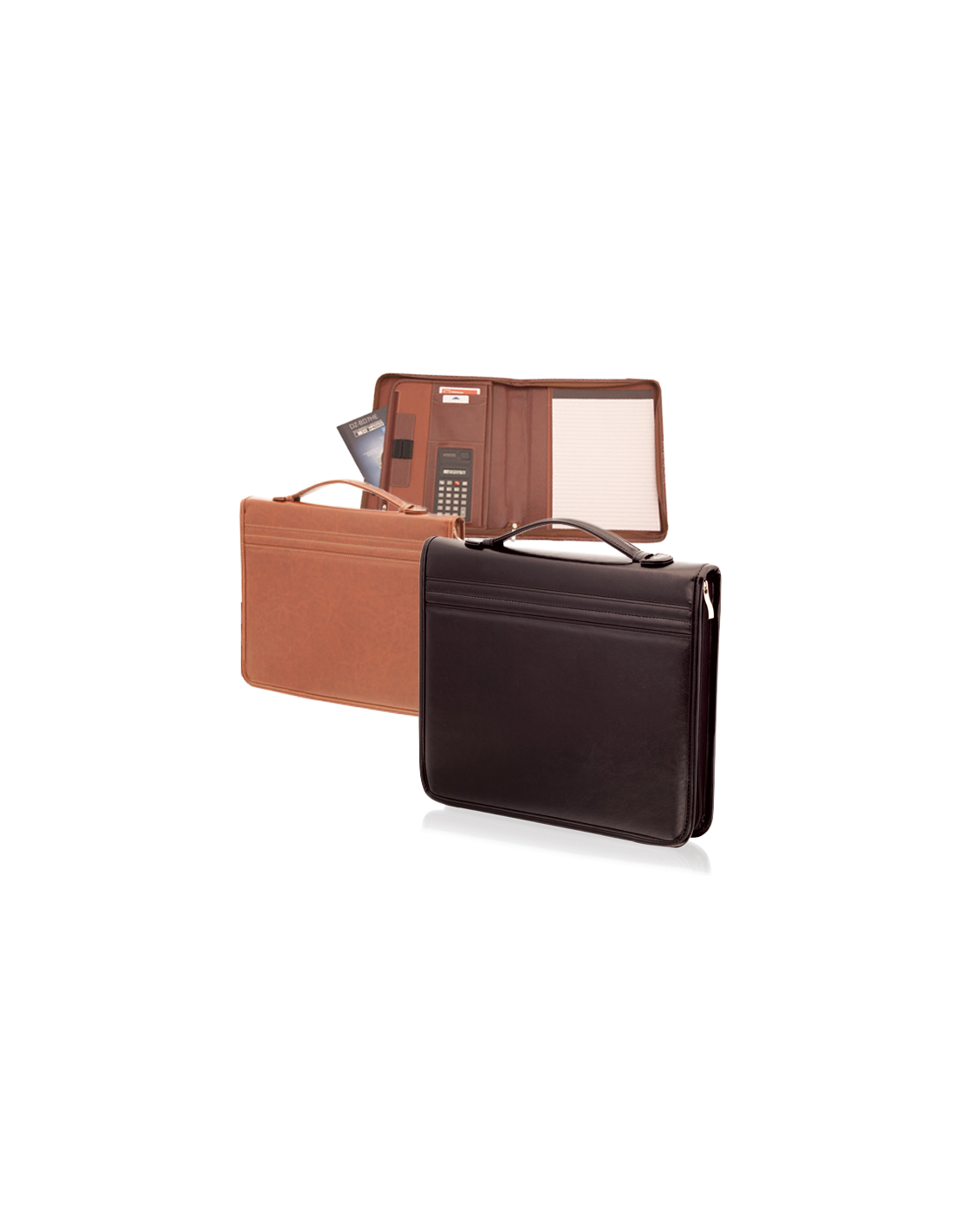 Maletín portadocumentos de alta calidad en suave y resistente polipiel, de elegante acabado y con calculadora incluida. Con practico bolsillo exterior y bolsillo interior con cremallera, compartimentos interiores para tarjetas y Lapiceross y bloc de notas extraíble de 20 hojas con distribución a una raya.