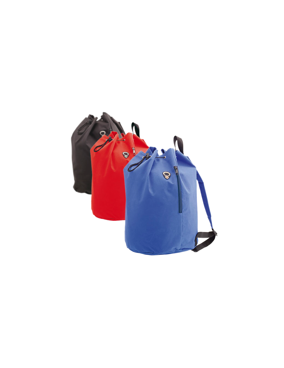 Mochila petate multiusos en resistente poliéster 600D de vivos colores. Cierre superior de cuerda con accesorio de ajuste y argollas metálicas reforzadas. Salida de auriculares y bolsillo exterior a juego, con cintas de hombros acolchadas y regulables.