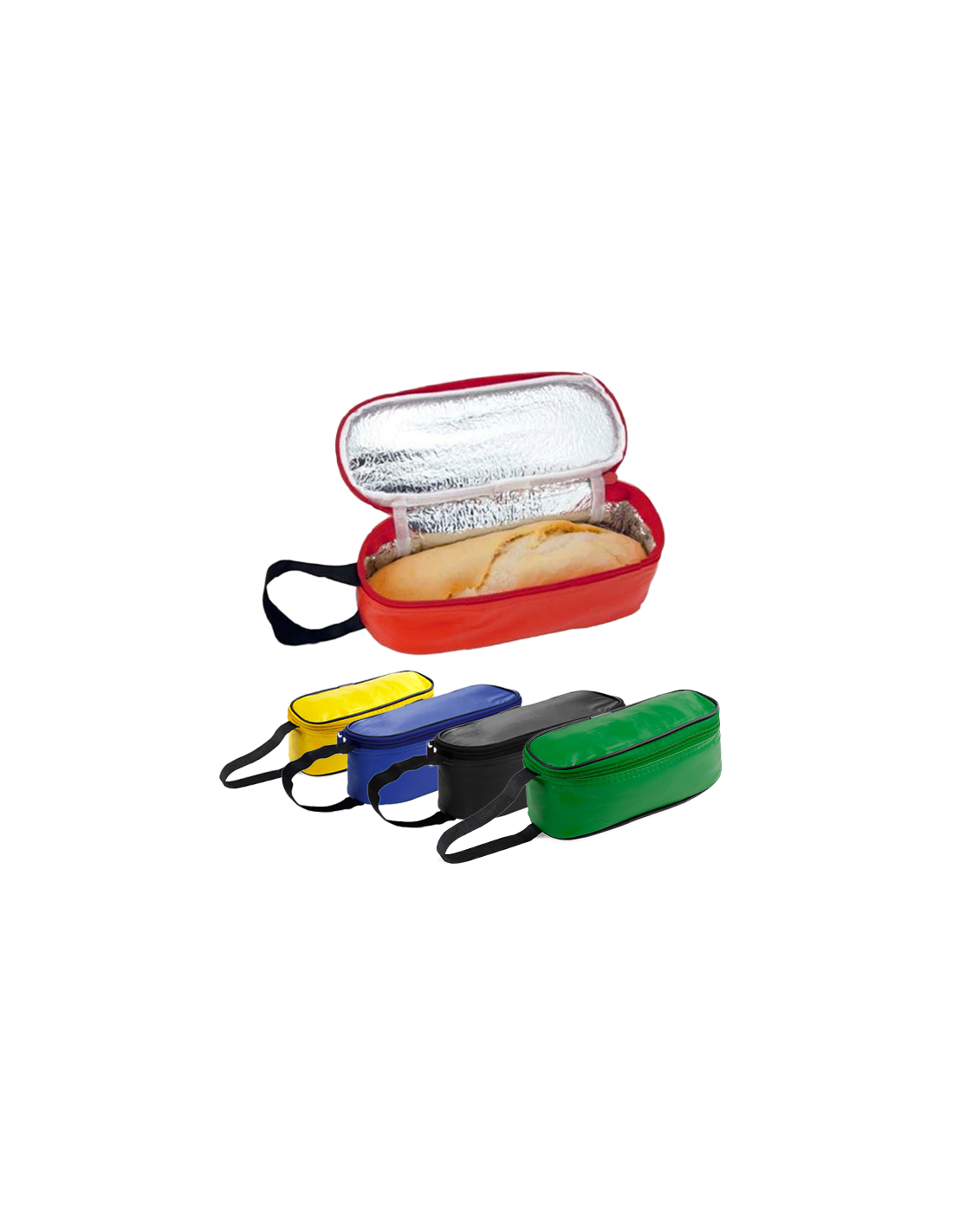 Portabocadillos en resistente PVC de vivos colores y con cierre de cremallera. Con asa en nylon reforzado e interior isotermo en acabado de aluminio.