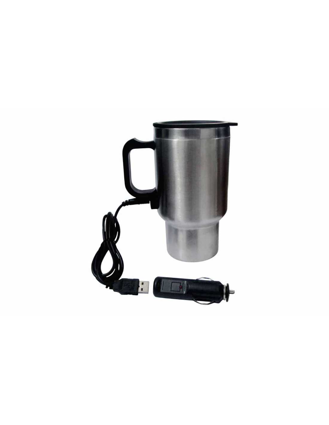 Jarro metálico de 450 ml. Con tapa de plástico con retén para evitar pérdidas y cable de conexión USB, con adaptador para auto, para mantener el calor.