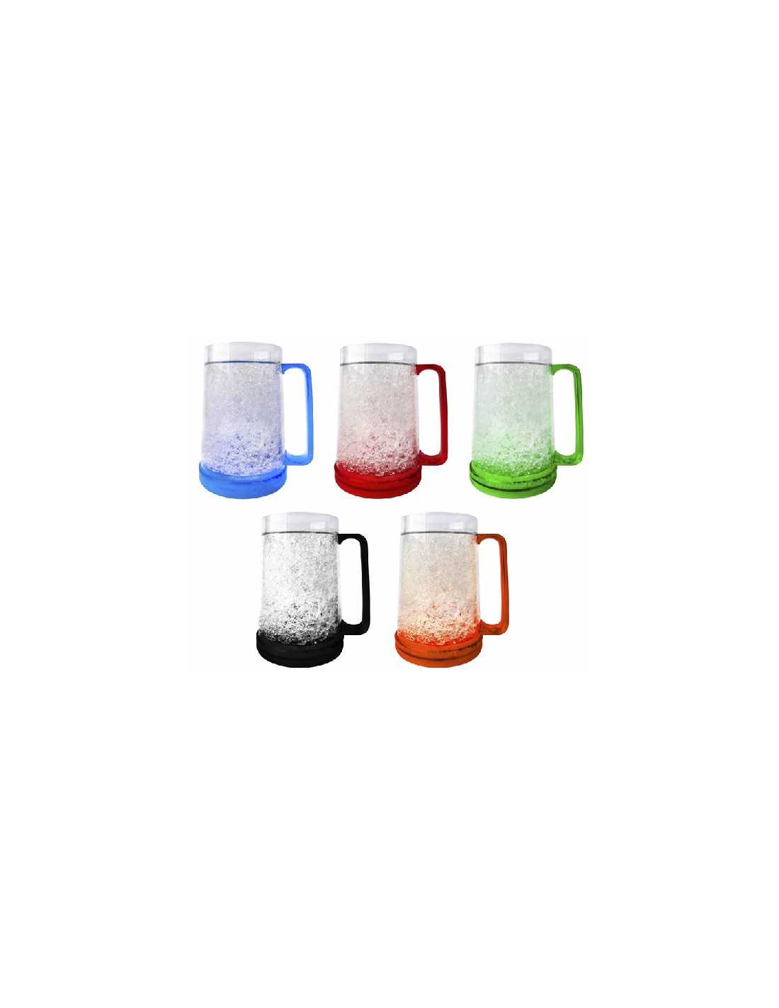 Jarro Mug que conserva liquidos frios, por el gel que contiene en el interior de sus paredes. Mug Plastico Frosty Capacidad: 500 ml. Material: Plastico PVC, para agua fria.
