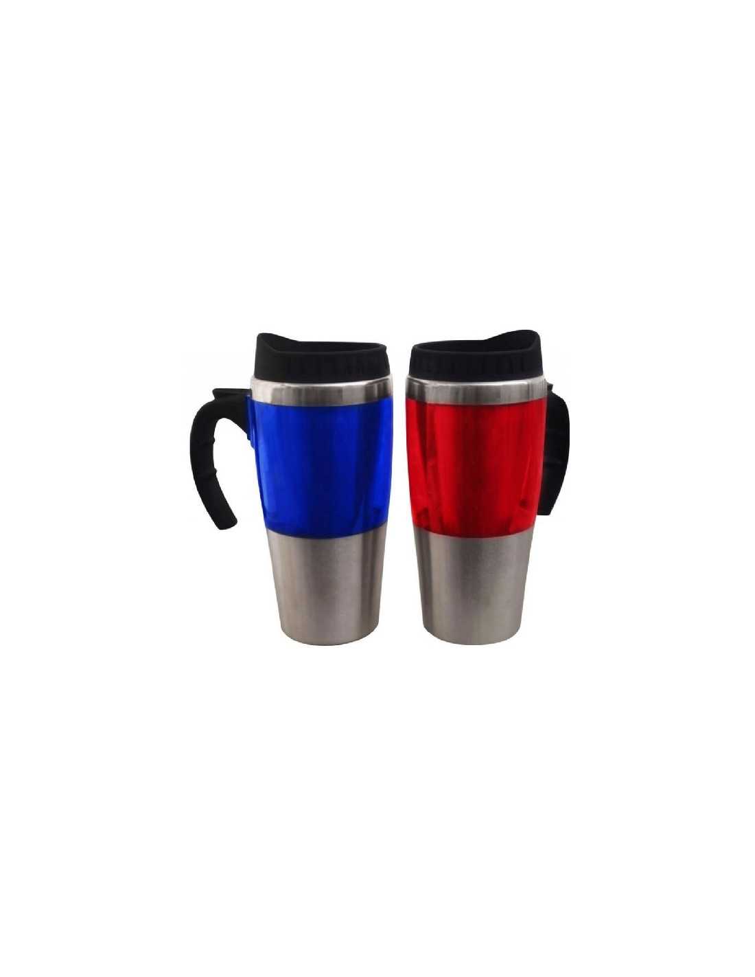 Interior de metal, por fuera cuerpo de metal con recubriento en el medio de Mug Acrilico Traslucido de color, asa y tapa de plastico negro. Mug Traslucido Bonitos Capacidad: 450 ml. Colores: Azul y rojo.